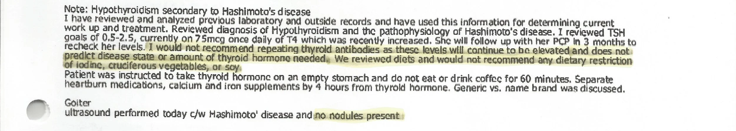Above are the notes I received from my endocrinology appointment. She told me my thyroid antibodies will be high forever and continue to increase through time and there was no point in re-checking them again in the future. When I questioned removing gluten, dairy, soy, etc. from my diet, she told me dietary changes would not make a difference. Finally, she told me hormonal birth control had no impact on my thyroid or the hormones it produced. Come to find out, she was wrong about all of it. I never went back and forged my own path.